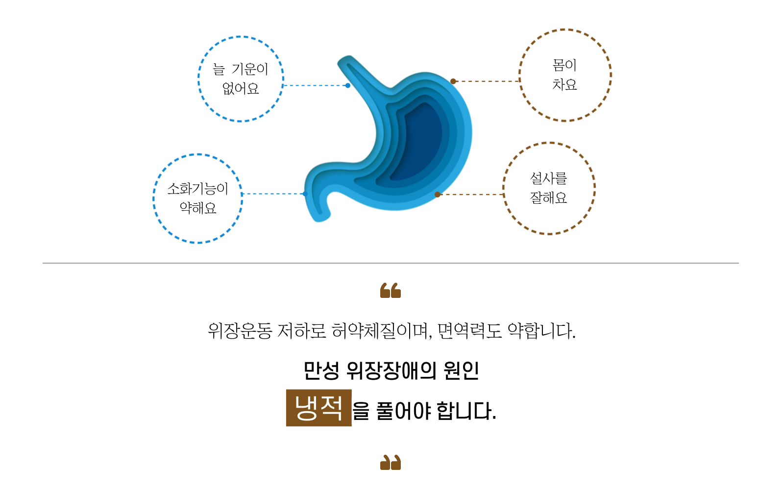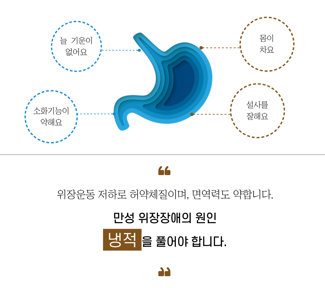 각 원인들이 복합적으로 작용하여 위장의 냉적을 유발합니다.